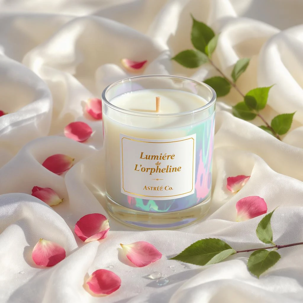 Lumière de L'orpheline is a luminous perfume candle evoking the quiet glow of dawn through delicate floral tea and soft rose. It opens with the gentle aroma of Tie Guanyin tea, shimmering with fresh citrus airiness. The heart unfolds into a watery floral accord touched by dew-kissed rose petals, leading to a serene, delicate base. It’s graceful, refined, and quietly radiant. Hand-poured with creamy white soy wax and infused with premium-grade fragrance oils, Lumière de L'orpheline is perfect for serene mornings, elegant interiors, and reflective moments.