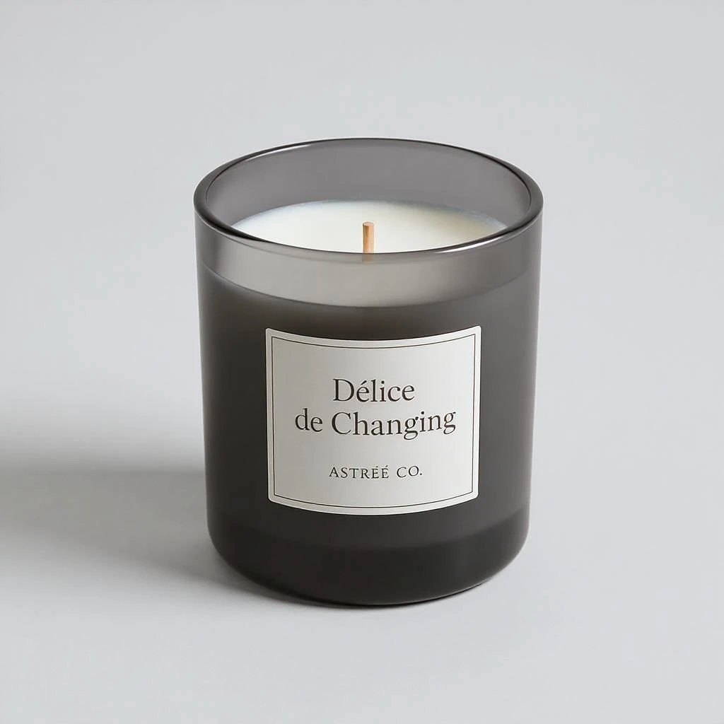 Délice de Changing is an ethereal perfume candle opening with the cool whisper of delicate incense, airy and light. It drifts into a heart of soft rose petals, infused with a subtle green freshness. The base is gently rooted by American ginseng, adding a refined herbal nuance that gives depth and tranquility. This candle feels graceful, poetic, and contemplative. Hand-poured with creamy white soy wax and infused with premium-grade fragrance oils, Délice de Changing elevates moments of quiet elegance and serene interiors.